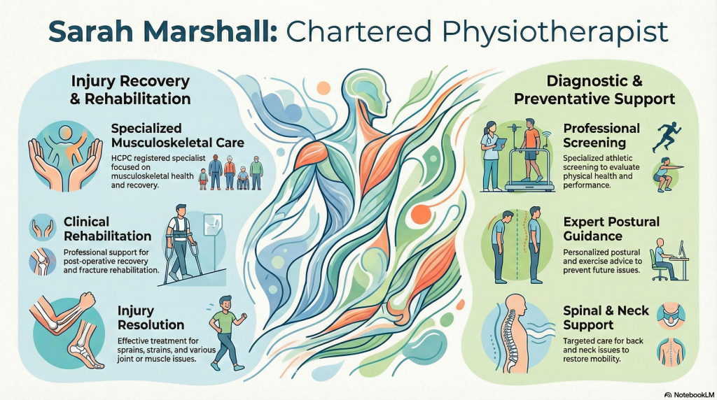 Physiotherapist Sarah Marshall is HCPC registered and specialises in Musculoskeletal Physiotherapy and Sports Injuries. She uses manual therapy, among other treatment methods.
